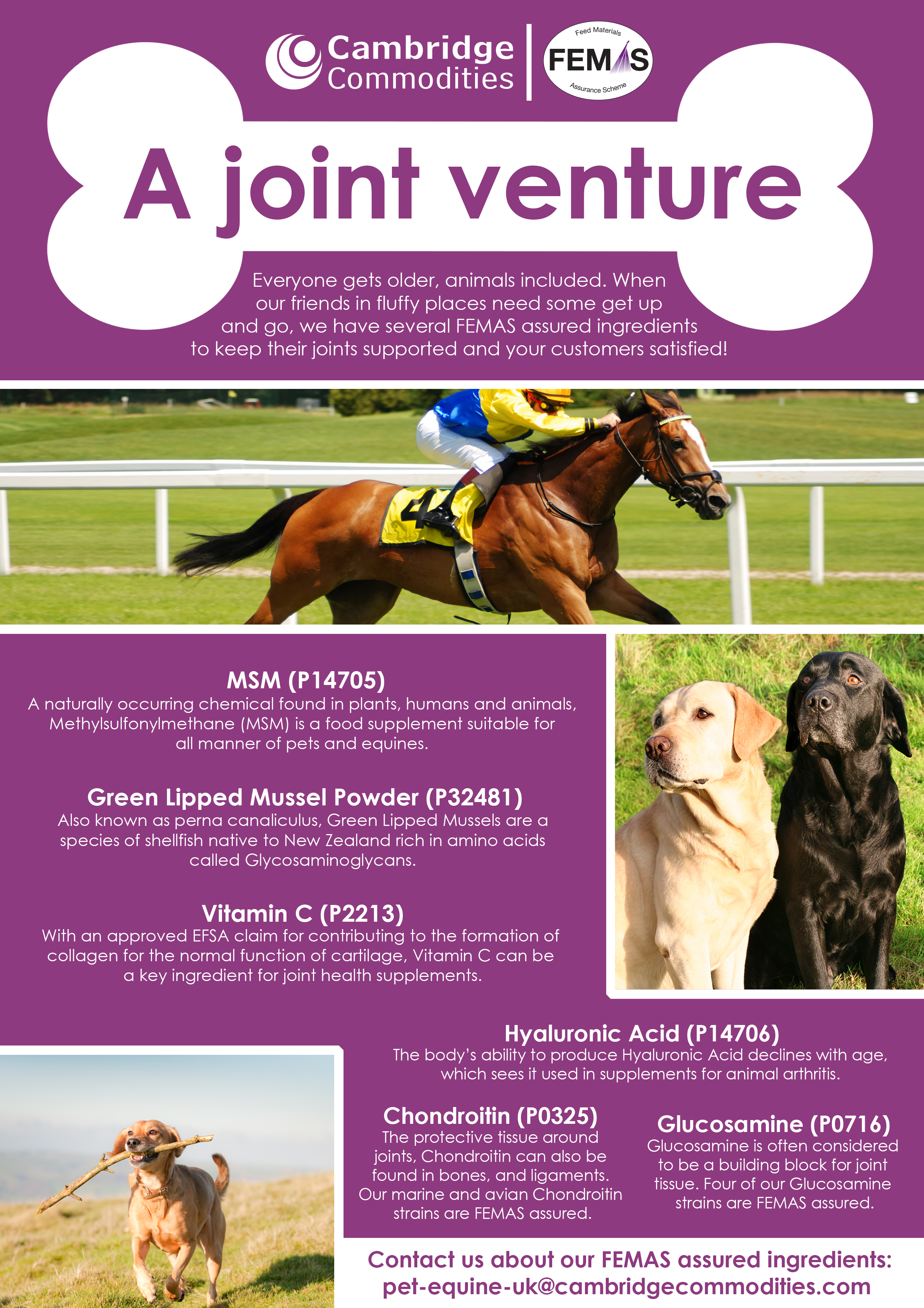 At Cambridge Commodities, we specialise in finding opportunities to spread health and wellbeing across a range of key industry sectors. If you’re curious about what you can do to position your pet and equine products for joint support, we have compiled a selection of some of our finest nutritional ingredients into a helpful graphic that’ll give you both an indication of what might work and the motivation to give us a call.