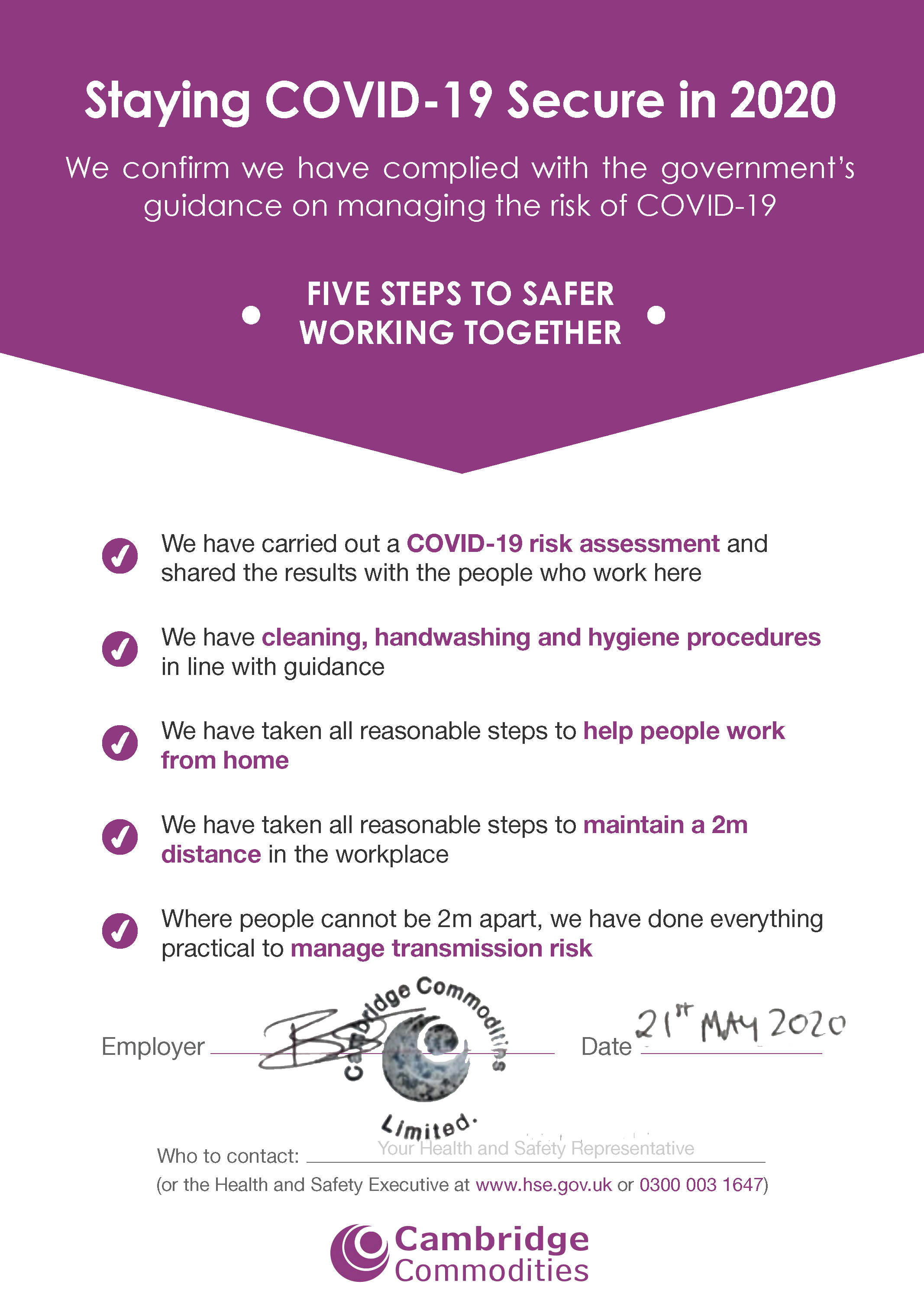 We are happy to announce that the Cambridge Commodities HQ is officially COVID-19 secure.