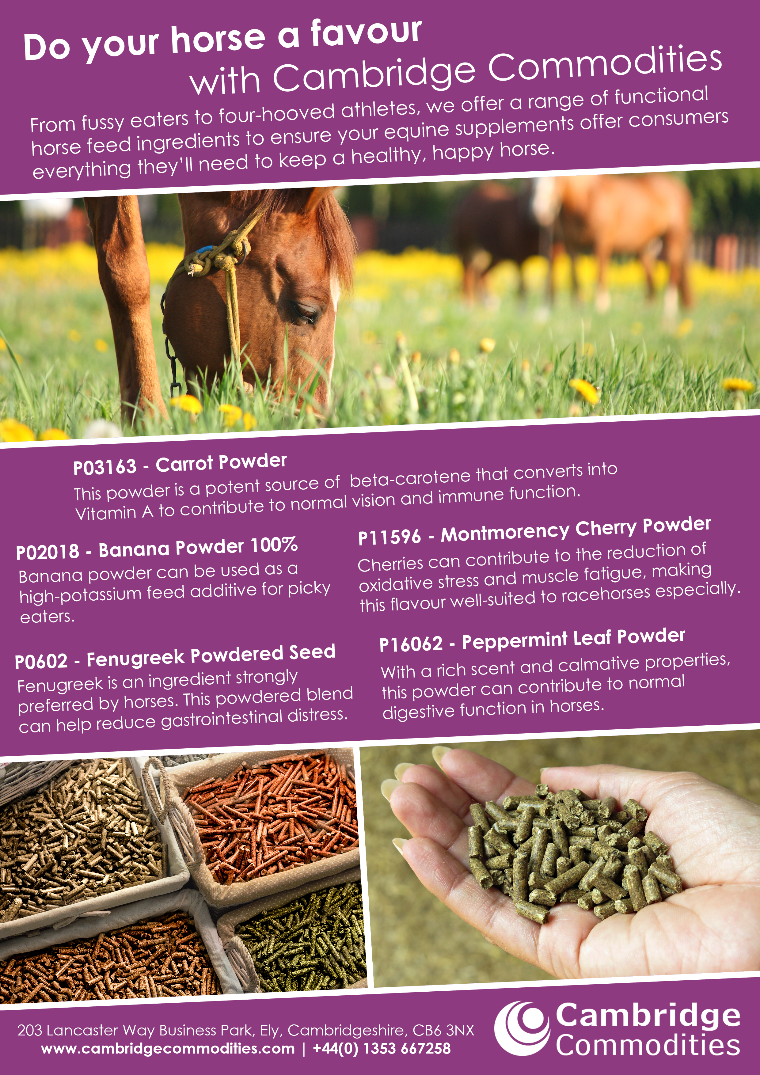 But regardless of what horses need, the question remains: what do they want? You do not necessarily need apposable thumbs to be a fussy eater, so finding ingredients that appeal to our four-hooved friends can be yet another obstacle in establishing a market foothold. For those who want to weigh their options, we at Cambridge Commodities have put together a poster detailing some functional horse ingredients that can help your brand to get back in the saddle.