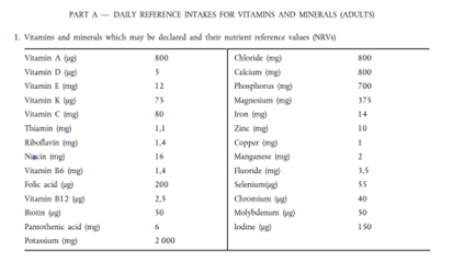 Regulation (EU) No 1169/2011 of the European Parliament and of the Council of 25 October 2011 on the provision of food information to consumers lists the nutrient reference value of Vitamin E as 12mg per day, as per the below: